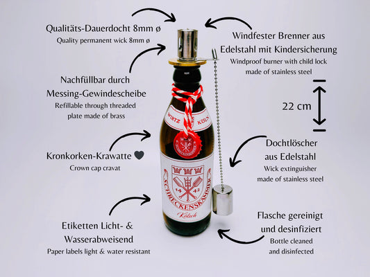 Kölsch-Öllampe “Kölner Lichter“ | Handgemachte Upcycling Öllampen aus Kölsch-Flaschen | Geschenk für Köln-Fans | Ideal für Garten & Balkon