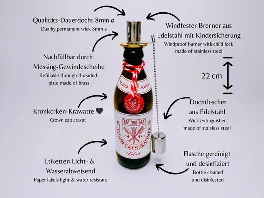 Kölsch-Öllampe "Kölner Lichter" | Handgemachte Upcycling Öllampen aus Kölsch-Flaschen für Balkon & Garten | Bier Geschenk für Köln-Fans