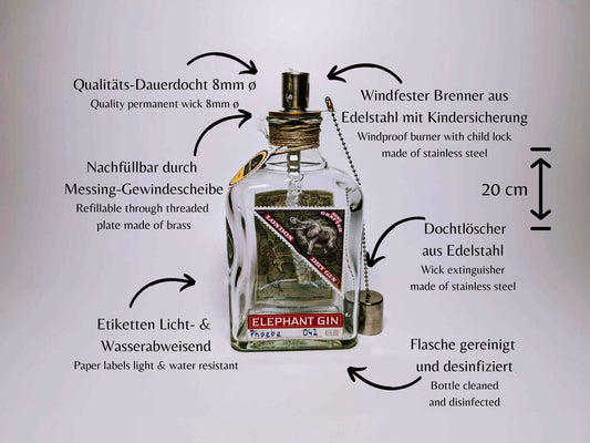 Gin Öllampe "Elephant" | Handgemachte Öllampe aus Elephant Gin Flaschen | Upcycling | Handgemacht | Individuell | Geschenk | Deko | H:20cm