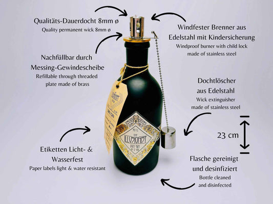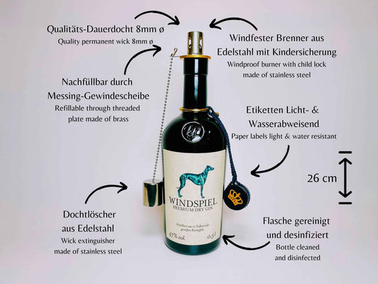Gin Öllampe "Windspiel" | Handgemachte Öllampe aus Windspiel Gin Flaschen | Upcycling | Handgemacht | Individuell | Geschenk | Deko | Balkon