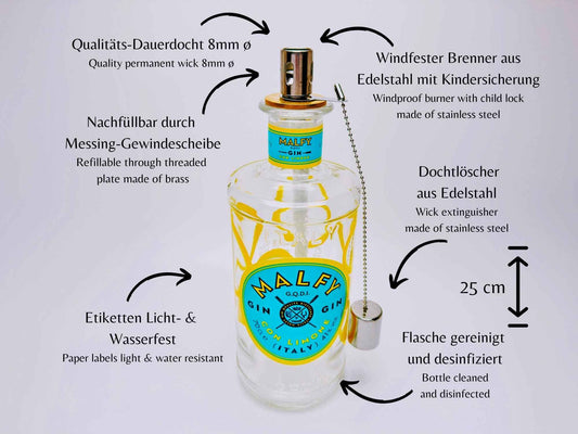 Gin Öllampe "Malfy" | Handgemachte Öllampe aus Malfy Gin Flaschen | Upcycling | Handgefertigt | Individuell | Geschenk | Deko | H:25cm, 0,7l