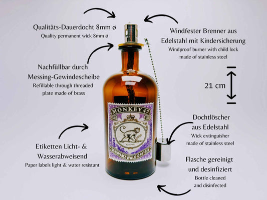 Gin Öllampe "Monkey 47" | Handgemachte Öllampe aus Monkey 47 Flaschen | Upcycling | Handgefertigt | Individuell | Geschenk | Deko | H:21cm